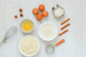 Zdjęcie "Skład ze składnikami do pieczenia i naczynia kuchenne widok z góry" może być wykorzystywane do celów osobistych i komercyjnych zgodnie z warunkami zakupionej licencji Royalty-free. Obraz jest dostępny do pobrania w jakości wysokiej rozdzielczości do 5760x3840.