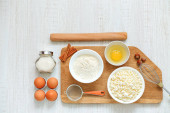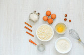 Skład ze składnikami do pieczenia i naczynia kuchenne widok z góry