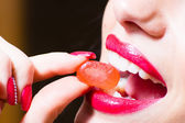 zbliżenie na piękne sexy kobieta z czerwone usta uwodzicielski i paznokci, Obgryzanie jujube, słodycze, zbliżenie
