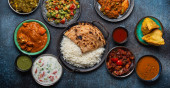 Różne indyjskie potrawy z ryżu i curry na drewnianym tle. Widok z góry
