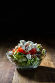 Sałatka z czerwonymi rybami i świeżymi warzywami na ręcznie robionym talerzu