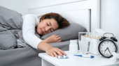 chora Azjatka leżąca w łóżku bierze tabletki i szklankę wody z nocnego stolika, aby złagodzić objawy