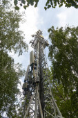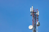 metalowa wieża z ruchomymi antenami komunikacyjnymi na tle niebieskiego nieba