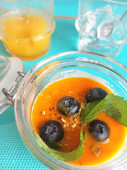 pieczony pucz z kremem dyniowym z mlekiem kokosowym serwowany w miseczce przy drewnianym czarnym stole. płaskie łóżko. gotowanie i koncepcja zdrowego życia