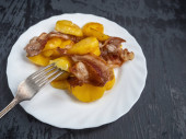 Lekkie śniadanie ze smażoną dynią i gotowanymi plastrami indyka z widelcem na białej talerzu