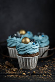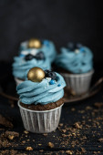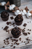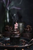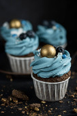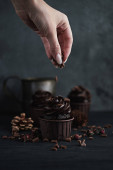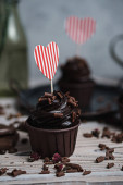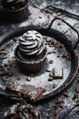 Muffinka lub babeczka z kremem w kształcie czekolady przy czarnym stole. Widok z góry płaski.