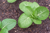 Zbliżenie duży głowa bok choy roślina z woda krople rośnie na ciemnej ziemi kompost w ogrodzie podwórkowym w pobliżu Dallas, Teksas, Ameryka. Homegrown organicznych zieleni liściastych ogród.