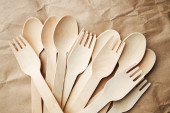 ekologiczne jednorazowe przybory kuchenne na papierowym tle. Spójrz z góry. drewniane widelce i łyżki. koncepcja przyjazna środowisku