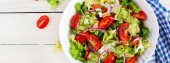 Sałatka ketogenna z prosciutto, pomidorami, ogórkiem, sałatą, czerwoną cebulą i serem w misce. Poczęstuj się zdrową przekąską. Keto, jedzenie paleo. Widok z góry, baner, przestrzeń do kopiowania