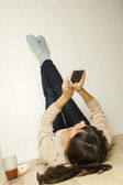 Kobieta na podłodze wiadomości tekstowe na telefon komórkowy