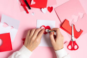 Ręce robią czerwoną kartkę walentynkową z papieru. Instrukcja krok po kroku DIY