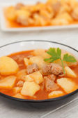Bonava is a traditional lamb and potatoes stew from Mauritania closeup in a bowl on the table. Vertica