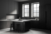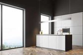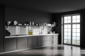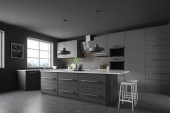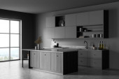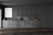 Nowoczesne wnętrze kuchni z szarymi ścianami, drewnianą parkietową podłogą i szarymi blatami. Duże okno z widokiem na okolicę. Ułóż plakat na ścianie. 3d renderowanie