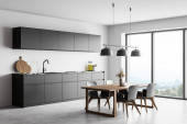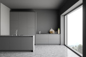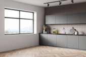 Zdjęcie "Nowoczesne wnętrze kuchni z szarymi ścianami, drewnianą parkietową podłogą i szarymi blatami. Duże okno z widokiem na okolicę. Ułóż plakat na ścianie. 3d renderowanie" może być wykorzystywane do celów osobistych i komercyjnych zgodnie z warunkami zakupionej licencji Royalty-free. Obraz jest dostępny do pobrania w jakości wysokiej rozdzielczości do 5760x3840.