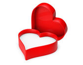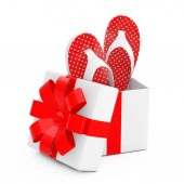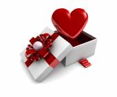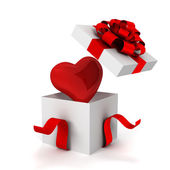 Białe pudełko i czerwona wstążka Maskotka znaków z czerwonym sercem na białym tle. 3d Renderowanie