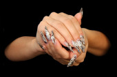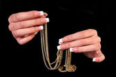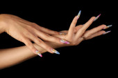 ludzkie palce z długim paznokciem i piękny manicure na czarnym tle