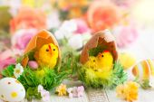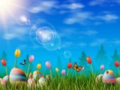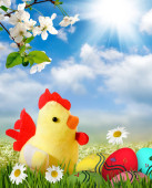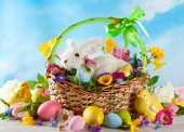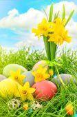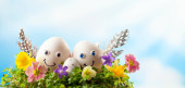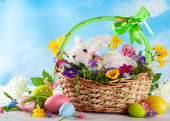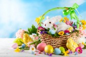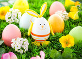 Festive decoration with Easter eggs, Bunny and beautiful spring flowers. Easter concept