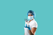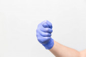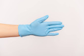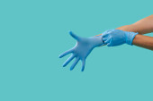 Boczny portret nierozpoznawalnej osoby zakładającej niebieskie medyczne rękawice ochronne wyizolowane na niebieskim tle