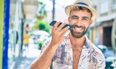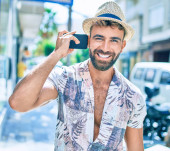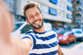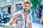Zdjęcie "Młody Hiszpan na wakacjach w słuchawkach robiący selfie przed kamerą na ulicy miasta" może być wykorzystywane do celów osobistych i komercyjnych zgodnie z warunkami zakupionej licencji Royalty-free. Obraz jest dostępny do pobrania w jakości wysokiej rozdzielczości do 5760x3840.