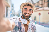 Młody Hiszpan na wakacjach w słuchawkach robiący selfie przed kamerą na ulicy miasta