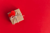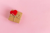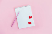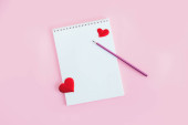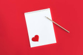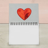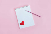 Notatnik z pustą kartką i czerwonym sercem na różowym tle z brokatem. Leżeć płasko. Miejsce na tekst.