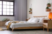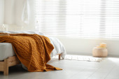 Duże łóżko z miękkim kocem w stylowym wnętrzu pokoju