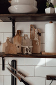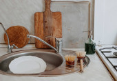 Różne potrawy - talerze, kieliszki do wina, miski w piance mydlanej na zlewie w kuchni. Widok z przodu