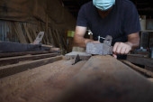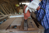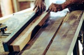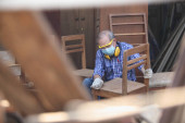 Stolarz, stolarz pracuje w warsztacie. Człowiek w pracy na drewnie. Obraz dojrzałego stolarza w warsztacie, koncepcja produkcji mebli.