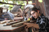 Zdjęcie "Stolarz, stolarz pracuje w warsztacie. Człowiek w pracy na drewnie. Obraz dojrzałego stolarza w warsztacie, koncepcja produkcji mebli." może być wykorzystywane do celów osobistych i komercyjnych zgodnie z warunkami zakupionej licencji Royalty-free. Obraz jest dostępny do pobrania w jakości wysokiej rozdzielczości do 5760x3840.