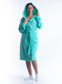 Kobieta w szlafroku na białym tle z uśmiechem na twarzy. Strzały w Studio w pełnym rozkwicie.