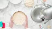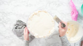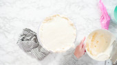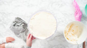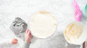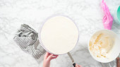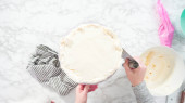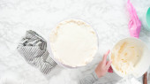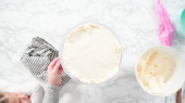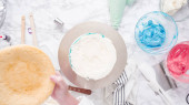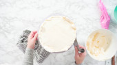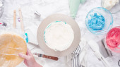 Leżeć płasko. Krok po kroku. Lukier okrągły funfetti ciasto z białym włoskim lukrem masło.