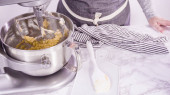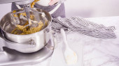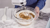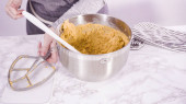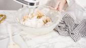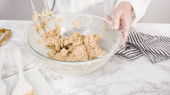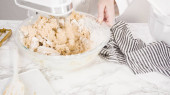 Krok po kroku. Składniki mieszające w stojącym mikserze elektrycznym do pieczenia ciasteczek z masłem orzechowym.