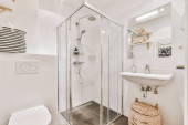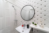 Zdjęcie "Nowoczesny kafelki jasne biało-czarne łazienka i WC w małym mieszkaniu typu studio. Wnętrze z szafką i umywalką na nim, okrągłe lustro, prysznic, WC i dywan na podłodze z przedpokoju" może być wykorzystywane do celów osobistych i komercyjnych zgodnie z warunkami zakupionej licencji Royalty-free. Obraz jest dostępny do pobrania w jakości wysokiej rozdzielczości do 5760x3840.
