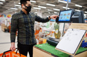 Azjaci noszą maski ochronne podczas pandemii w supermarkecie. Zabieranie warzyw z lodówki.