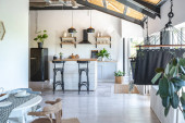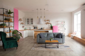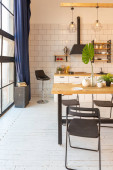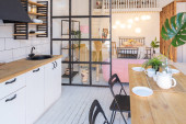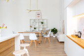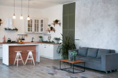 Zdjęcie "Nowoczesna kuchnia Wnętrze z wyspy, zlewozmywak, szafki i duże okno w nowym luksusowym domu." może być wykorzystywane do celów osobistych i komercyjnych zgodnie z warunkami zakupionej licencji Royalty-free. Obraz jest dostępny do pobrania w jakości wysokiej rozdzielczości do 5760x3840.