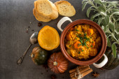 Zdjęcie "Domowej roboty krewetki i kasza z wędzonymi kiełbaskami, słodka czerwona papryka, cebula i ser w różowej misce na ciemnym betonowym tle. Kuchnia amerykańska. Przepisy z kaszą kukurydzianą. Widok z góry." może być wykorzystywane do celów osobistych i komercyjnych zgodnie z warunkami zakupionej licencji Royalty-free. Obraz jest dostępny do pobrania w jakości wysokiej rozdzielczości do 5760x3840.