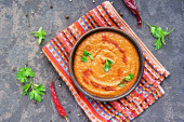 Zdjęcie "Przekąska hummus czerwony soczewica i czerwony pieprz w glinianej misce na ciemnym tle betonu." może być wykorzystywane do celów osobistych i komercyjnych zgodnie z warunkami zakupionej licencji Royalty-free. Obraz jest dostępny do pobrania w jakości wysokiej rozdzielczości do 5760x3840.
