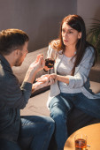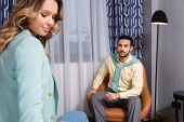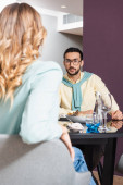 Arabski mężczyzna trzyma kieliszek wina w pobliżu dziewczyny na zamazanym pierwszym planie w hotelu