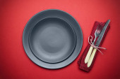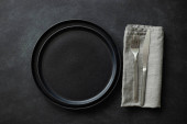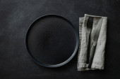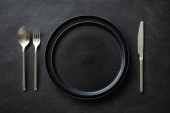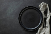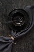 Zdjęcie "Puste czarne talerze ze sztućcami i serwetką." może być wykorzystywane do celów osobistych i komercyjnych zgodnie z warunkami zakupionej licencji Royalty-free. Obraz jest dostępny do pobrania w jakości wysokiej rozdzielczości do 5760x3840.