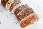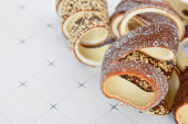 Widok z góry "Berliner Pfannkuchen", tradycyjny niemiecki pączek jak deser wypełniony dżemem ze słodkich drożdży smażonych w tłuszczu
