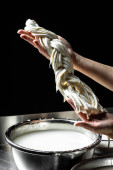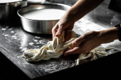 Cheesemaker przygotowuje formę sera mozzarella z wykorzystaniem świeżego i bio mleka. Przetwórstwo Tradycyjna włoska mozzarella.