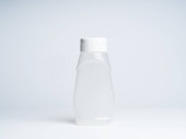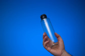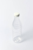 Przezroczysta, pusta plastikowa butelka z czerwonym wieczkiem i białą, pustą etykietą na jasnoniebieskim tle.