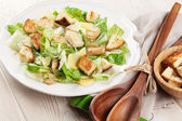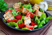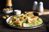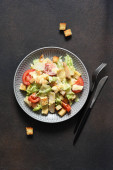 Sałatka cesarska. Sałatka z liśćmi rzymskimi, kurczakiem i tomanami w talerzu. Koncentracja horyzontalna.