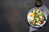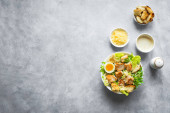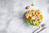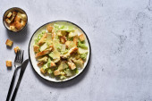 Klasyczna sałatka Cezara z kurczakiem, pomidorem i sosem w talerzu na ciemnym betonowym tle, widok z góry.