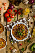 Domowej roboty jedzenie, gulasz z czarnej fasoli, świetne kaloryczne danie w chłodne dni. Podawany w głębokiej płycie, zarys z częścią składników, garnek i naczynia.