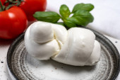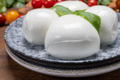 Kolekcja serów, białe kulki miękkiego włoskiego sera mozzarella, podawane z czerwonymi pomidorami wiśniowymi, świeże liście bazylii z bliska