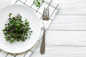 Świeże zielone mieszane miski sałatkowe z pomidorami i mikrozielonymi na czarnym tle betonu. Zdrowe jedzenie, widok z góry.