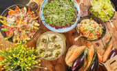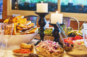 Stół świąteczny z kanapkami z czerwonym i czarnym kawiorem, sałatkami i gorącymi przekąskami.