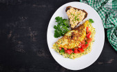 Zdrowa dieta niskowęglowodanowa ze smażonymi stekami z tuńczyka, kapustą savoy, pomidorami i cytryną na niebieskim talerzu oraz ciemnoniebieskim, rustykalnym drewnianym stole, przestrzeń do kopiowania, wybrane ognisko, wąska głębia ostrości
