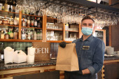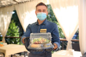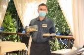 Kelner serwujący jedzenie w restauracji. Usługi cateringowe podczas kwarantanny koronawirusów